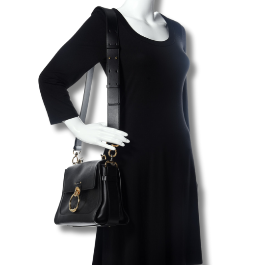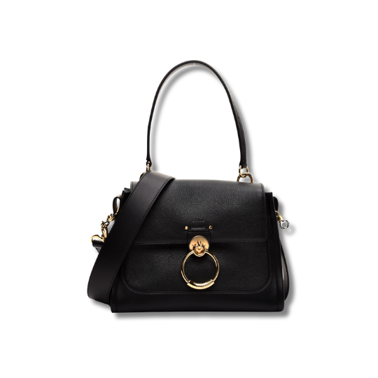This is an authentic CHLOE Calfskin Small Tess Day Bag in Black. This stylish handbag is crafted of textured calfskin leather in black. It features a top handle and an adjustable leather shoulder strap. The bag includes polished silver and gold hardware including a decorative ring. The flap opens to a front pocket and beige fabric interior with a zipper pocket.