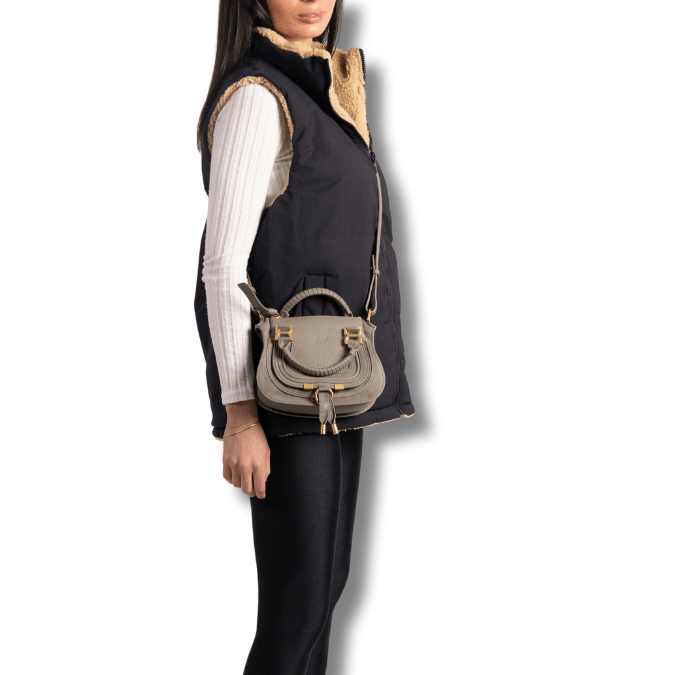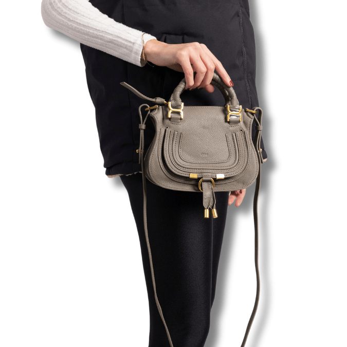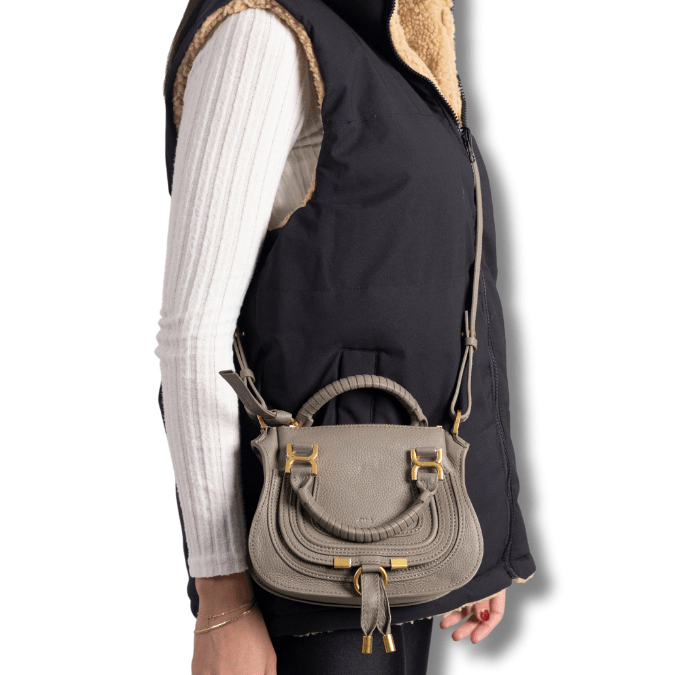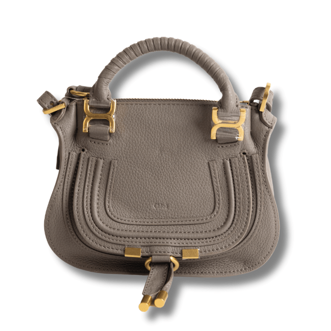 A more compact version of the iconic Marcie purse, this small double carry bag is crafted from grained calfskin. Clean lines and a contoured design enhance the slouchy silhouette, while hand-wrapped leather handles add crafty detail. The signature metallic buckles lend a refined finish. Double handles and a long, removable shoulder strap make this small double carry bag a truly versatile accessory.