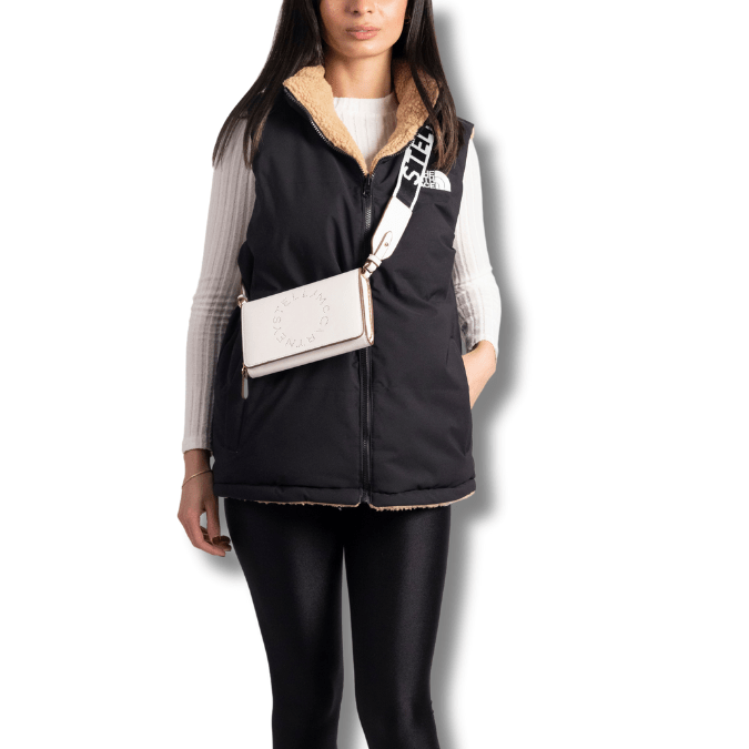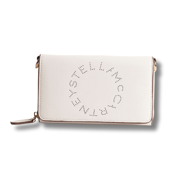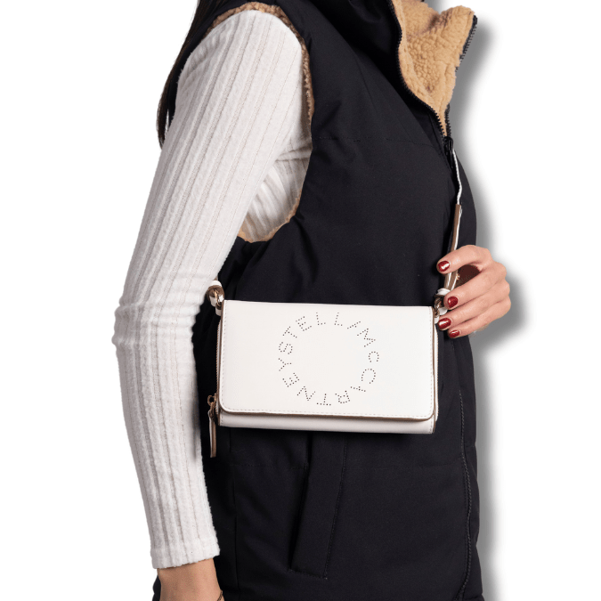 Faux leather wallet Color: White Openwork Stella McCartney logo Adjustable and removable branded shoulder strap Zip pocket and two compartments Compartment on the back 4 card slots 2 front welt pockets Snap button fastening
