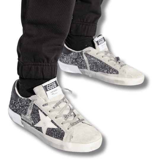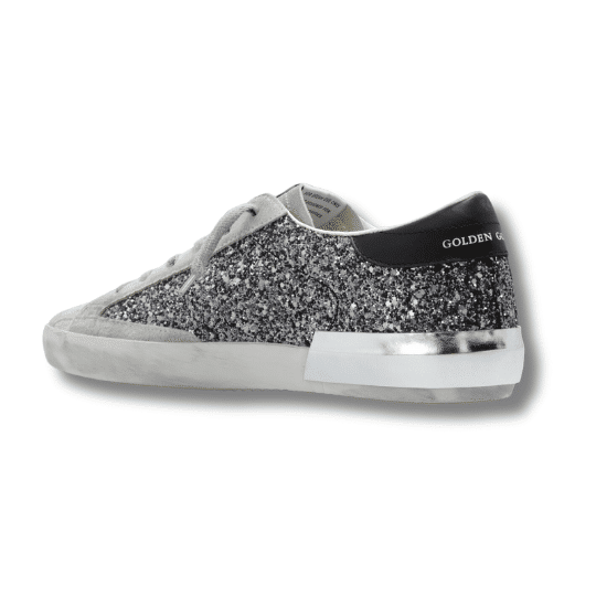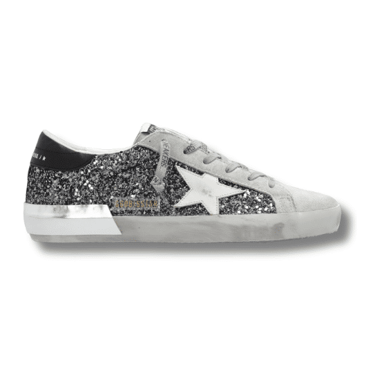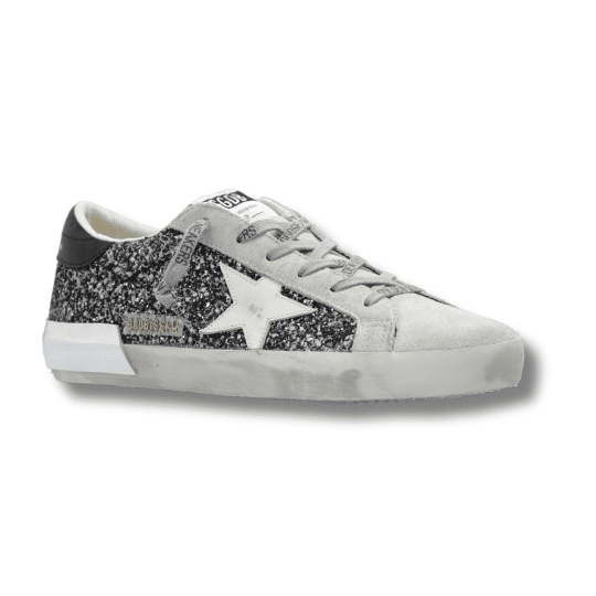 Grey, silver-tone and black ‘Super-Star Classic’ sneakers from Golden Goose. Made of suede embellished with glitter, this lace-up pair features a logo, star patch, dirty and distressed treatment and a grey rubber sole with a glitter finish.