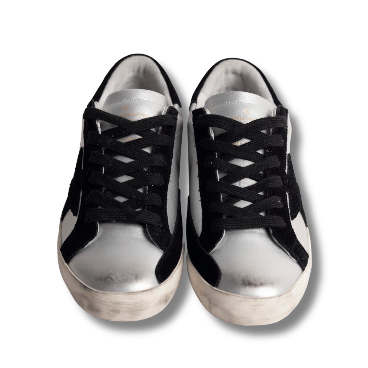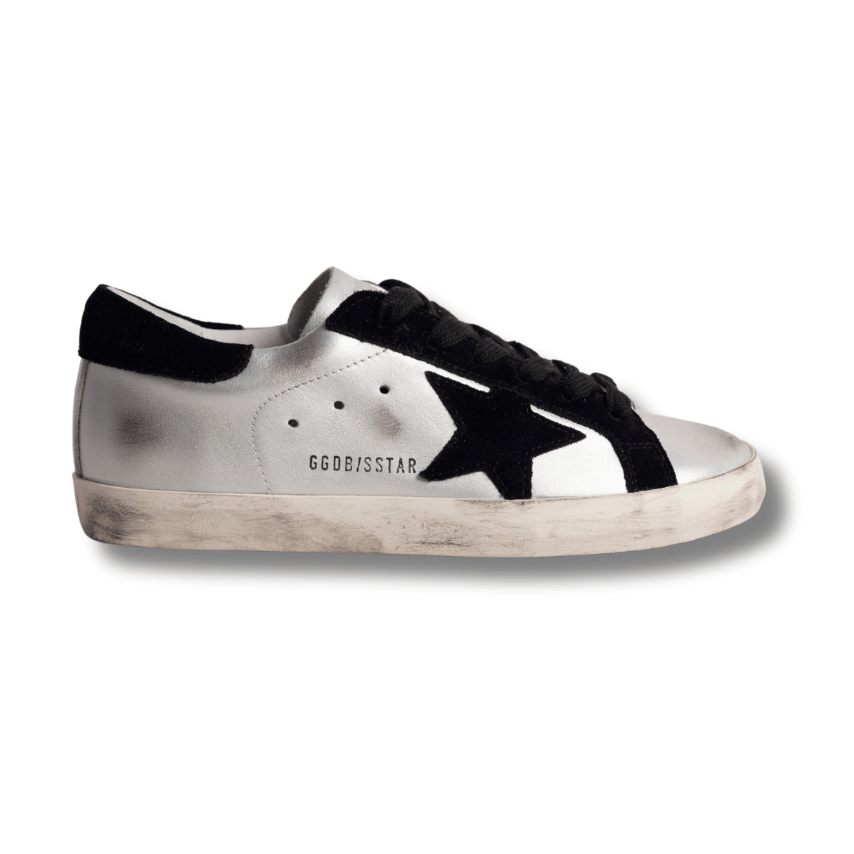 The iconic design of the Super-Star sneakers is updated every season with exclusive finishes and combinations of innovative materials. This style features a silver leather upper with contrasting black leather inserts.