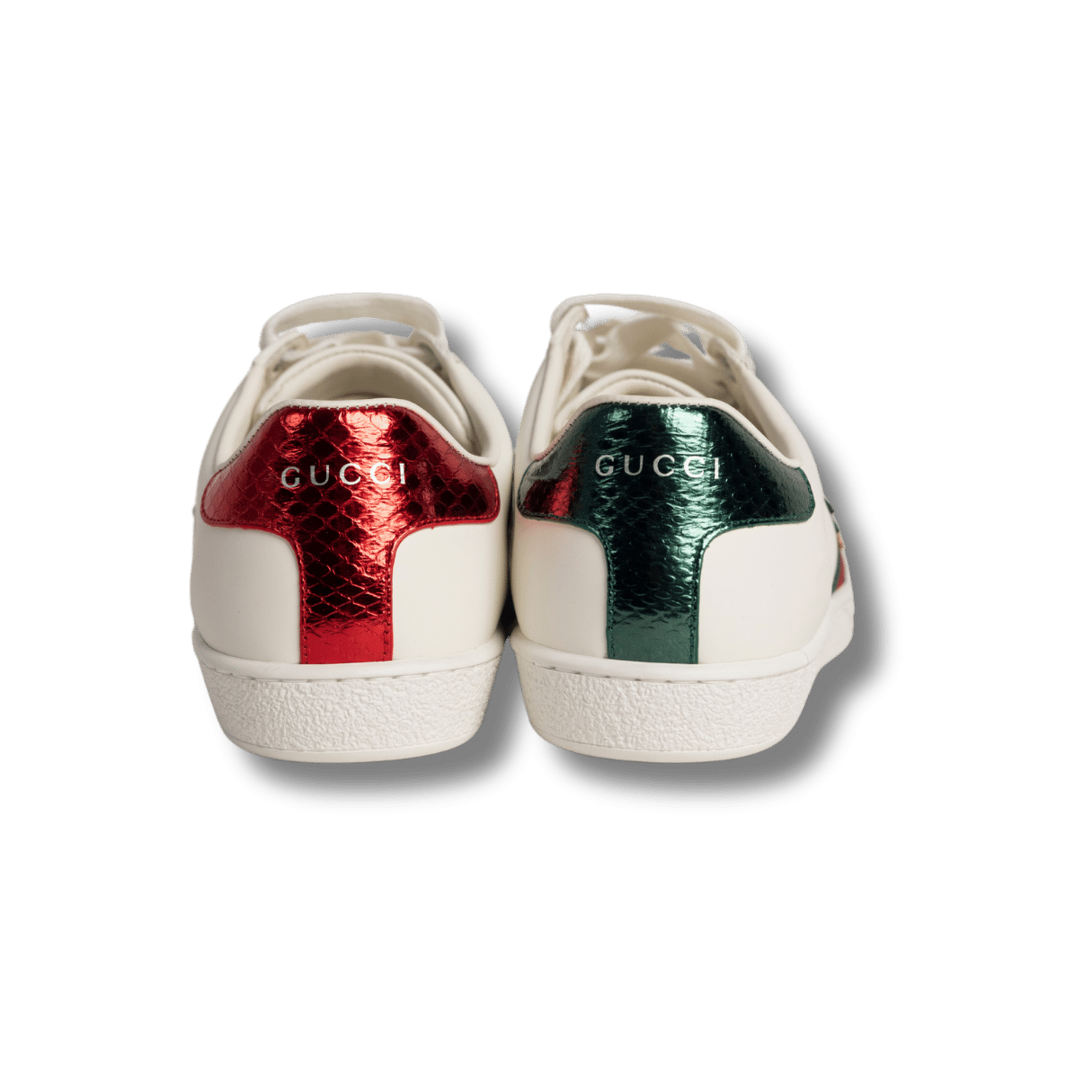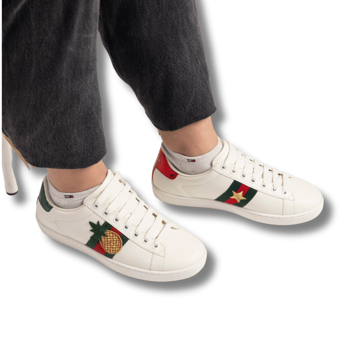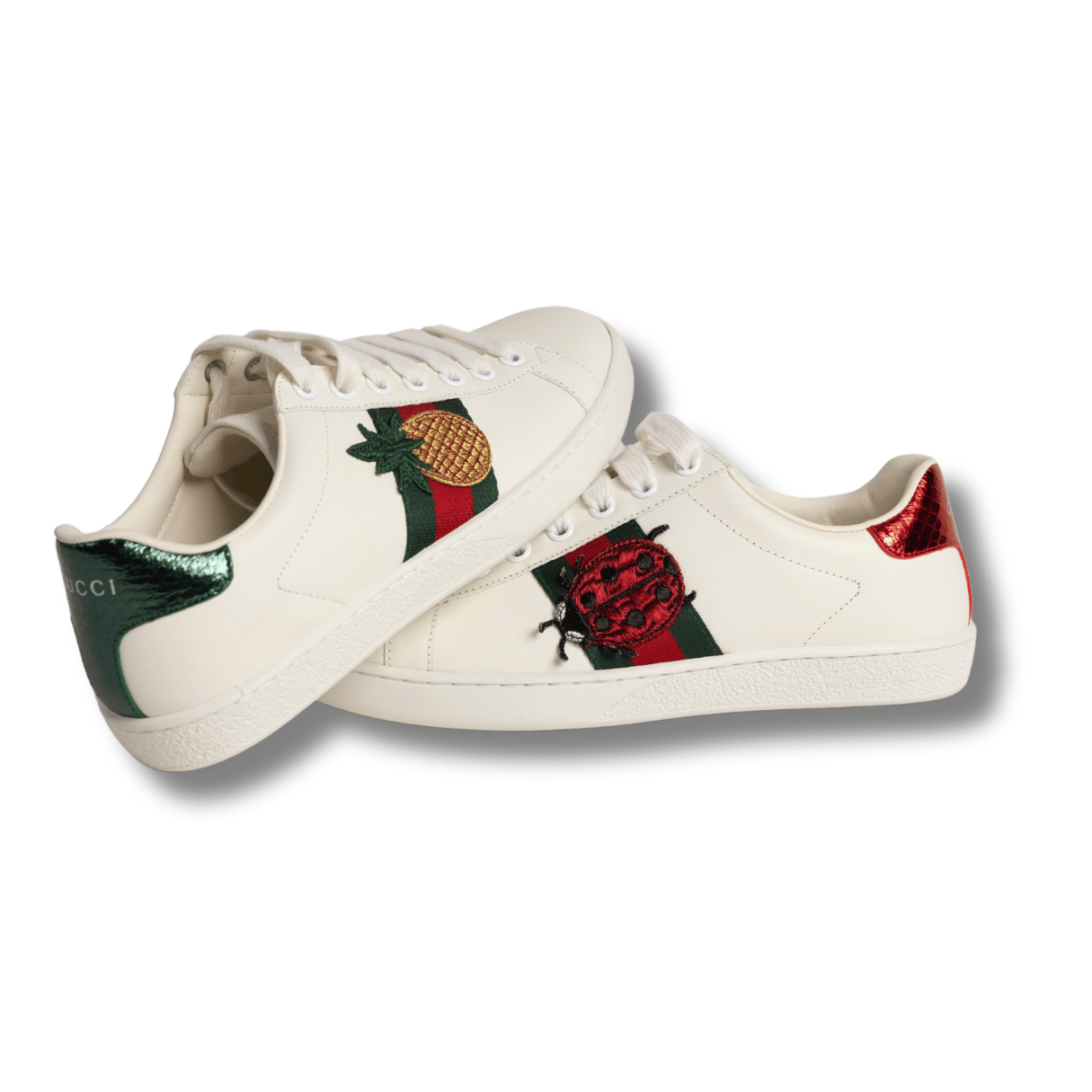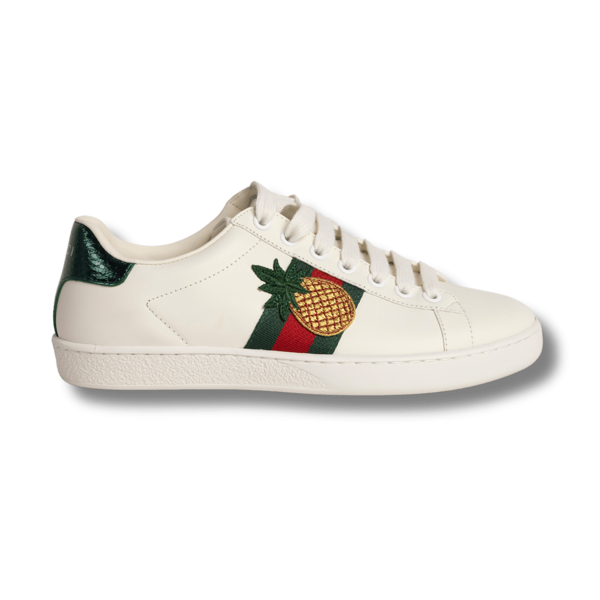 White leather Gucci Ace low-top sneakers with Web trim at sides featuring embroidered accents, embossed trim, rubber soles and lace-up closures at uppers. Includes box and dust bag.