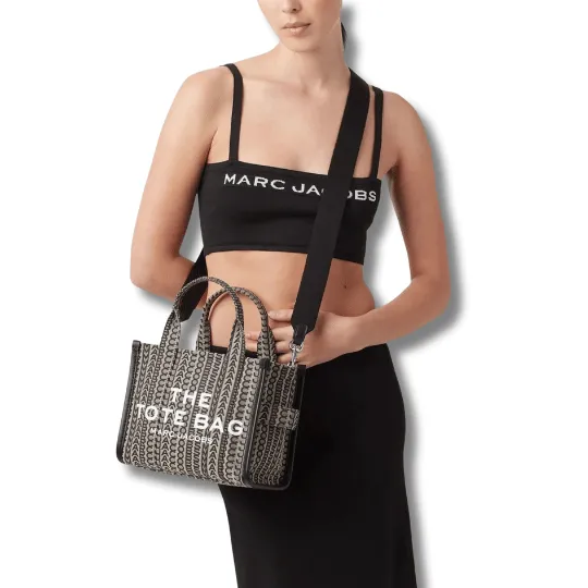 Designed with a cotton-blend construction, this The Monogram Tote bag from Marc Jacobs is embellished with a logo detail on the front. The brown-hued accessory is topped with two handles and a detachable shoulder strap.