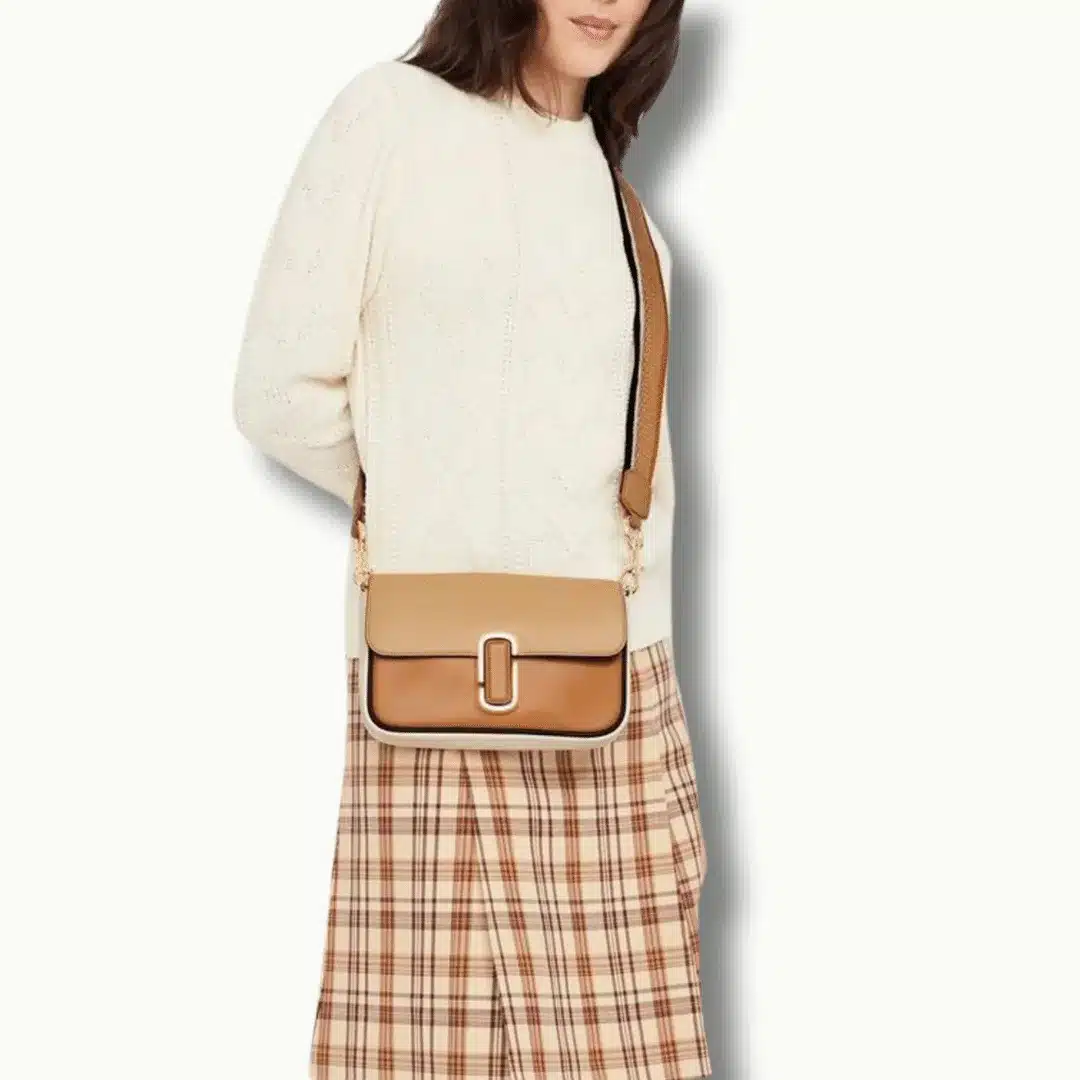 The Colorblock J Marc shoulder bag from Marc Jacobs featuring cream, brown, leather, colour-block design, gold-tone logo plaque, foldover top with magnetic fastening, main compartment, internal zip-fastening pocket, internal slip pocket and chain-link shoulder strap.