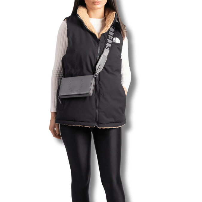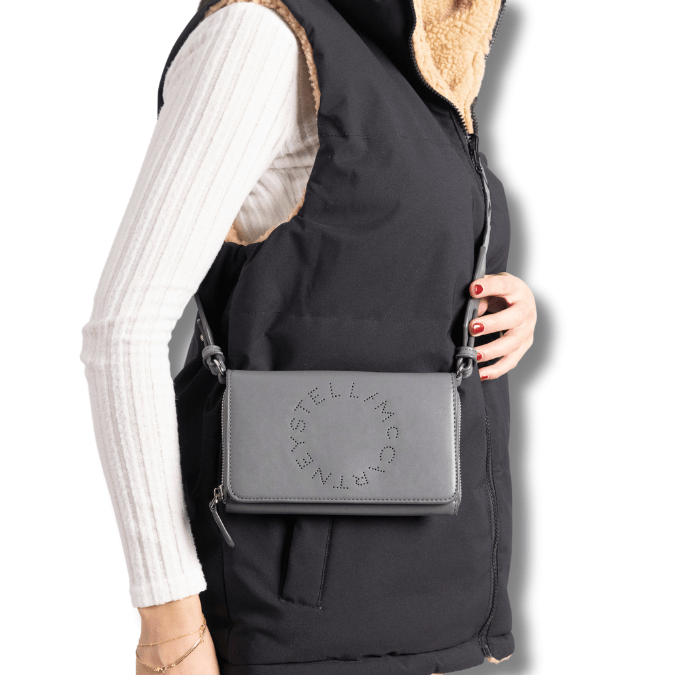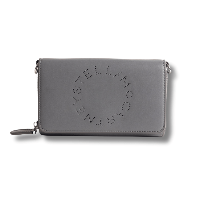 Faux leather wallet Color: Grey Openwork Stella McCartney logo Adjustable and removable branded shoulder strap Zip pocket and two compartments Compartment on the back 4 card slots 2 front welt pockets Snap button fastening