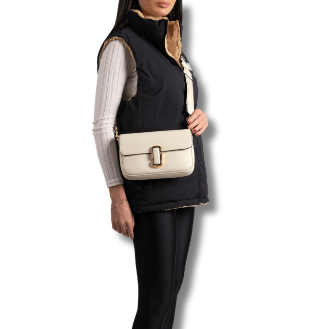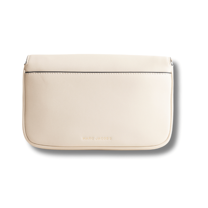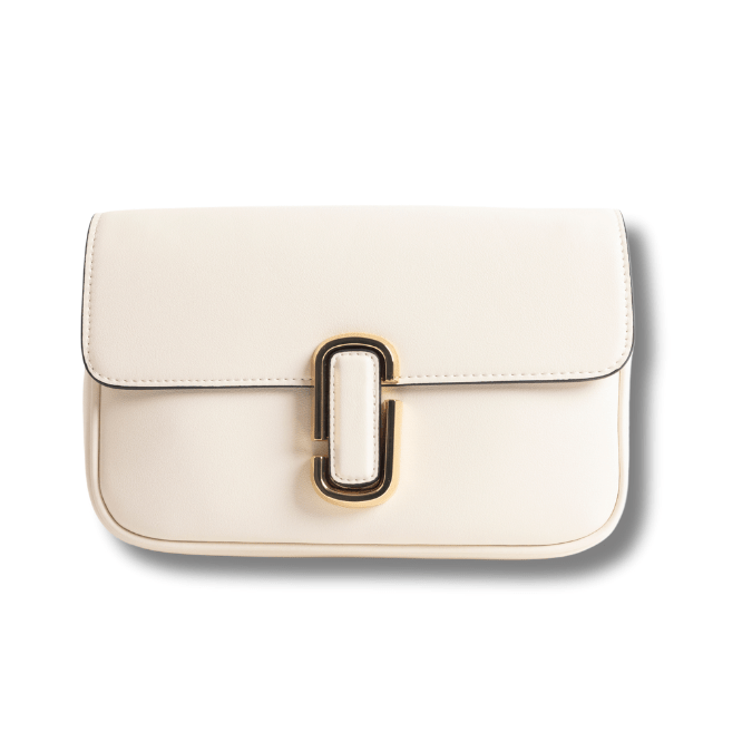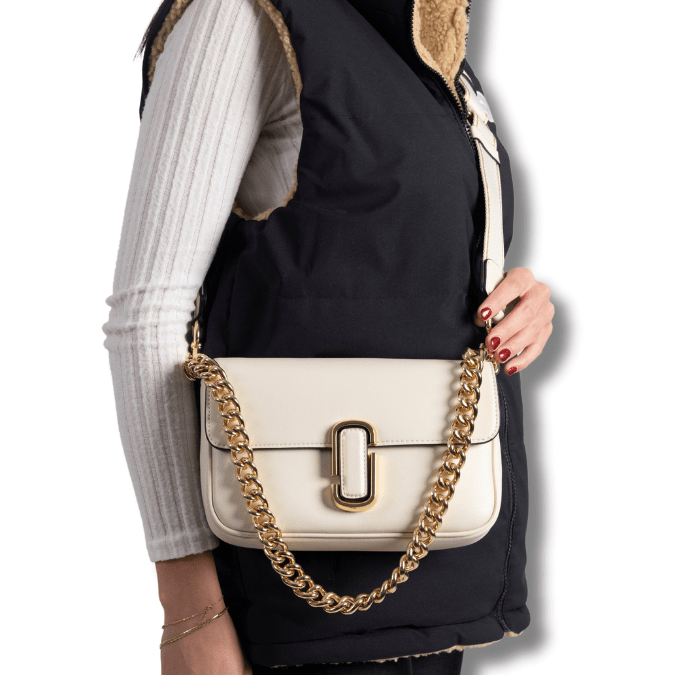 The J Marc leather shoulder bag from Marc Jacobs featuring cloud white, calf leather, gold-tone logo lettering, logo-print strap, single chain-link top handle, gold-tone hardware, adjustable detachable shoulder strap, fold over top with magnetic fastening, slip pocket to the front, main compartment, internal logo patch and internal zip-fastening pocket.